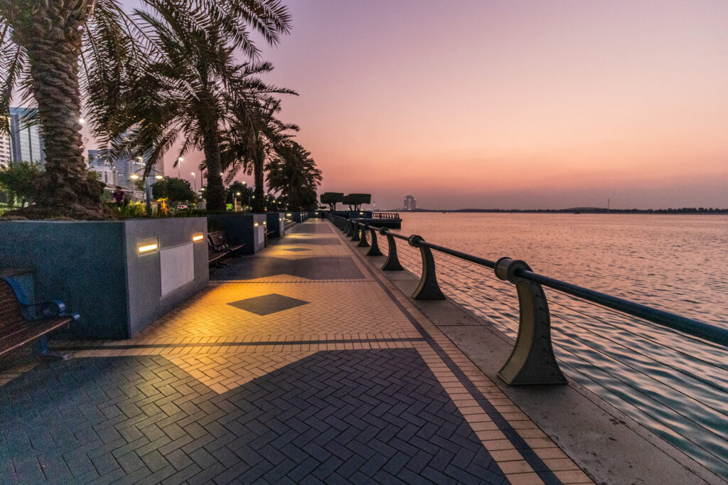 La Corniche d’Abu Dhabi a été récemment rénovée. Elle s’étend sur 8 km sur le front de mer et offre une vue imprenable sur le Golfe Persique, notamment au coucher de soleil. On y trouve pistes cyclables et sentiers piétons, jeux pour enfants, plages, restaurants…